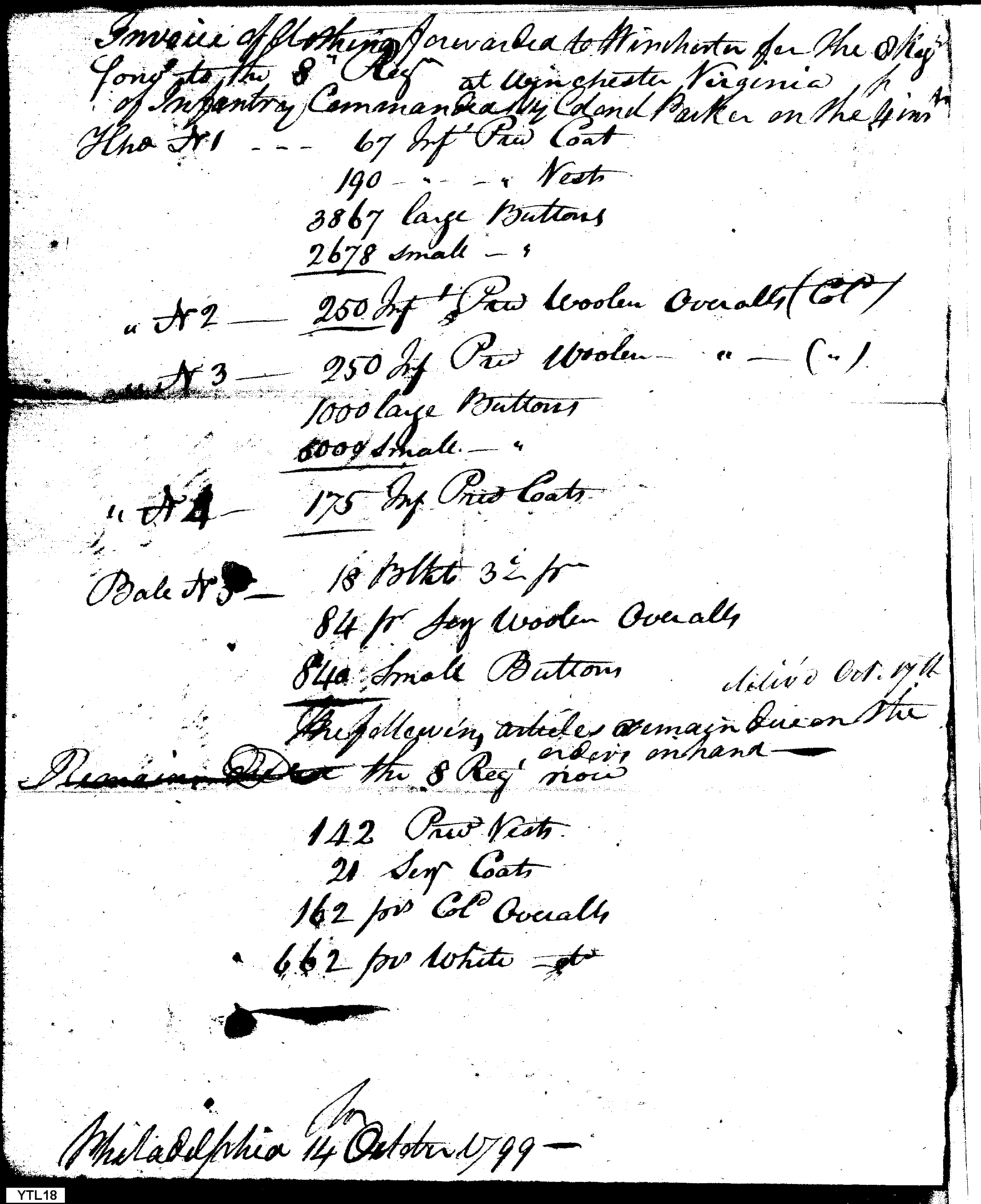 - Document: Copy of Invoice of clothing forwarded to Winchester Virginia