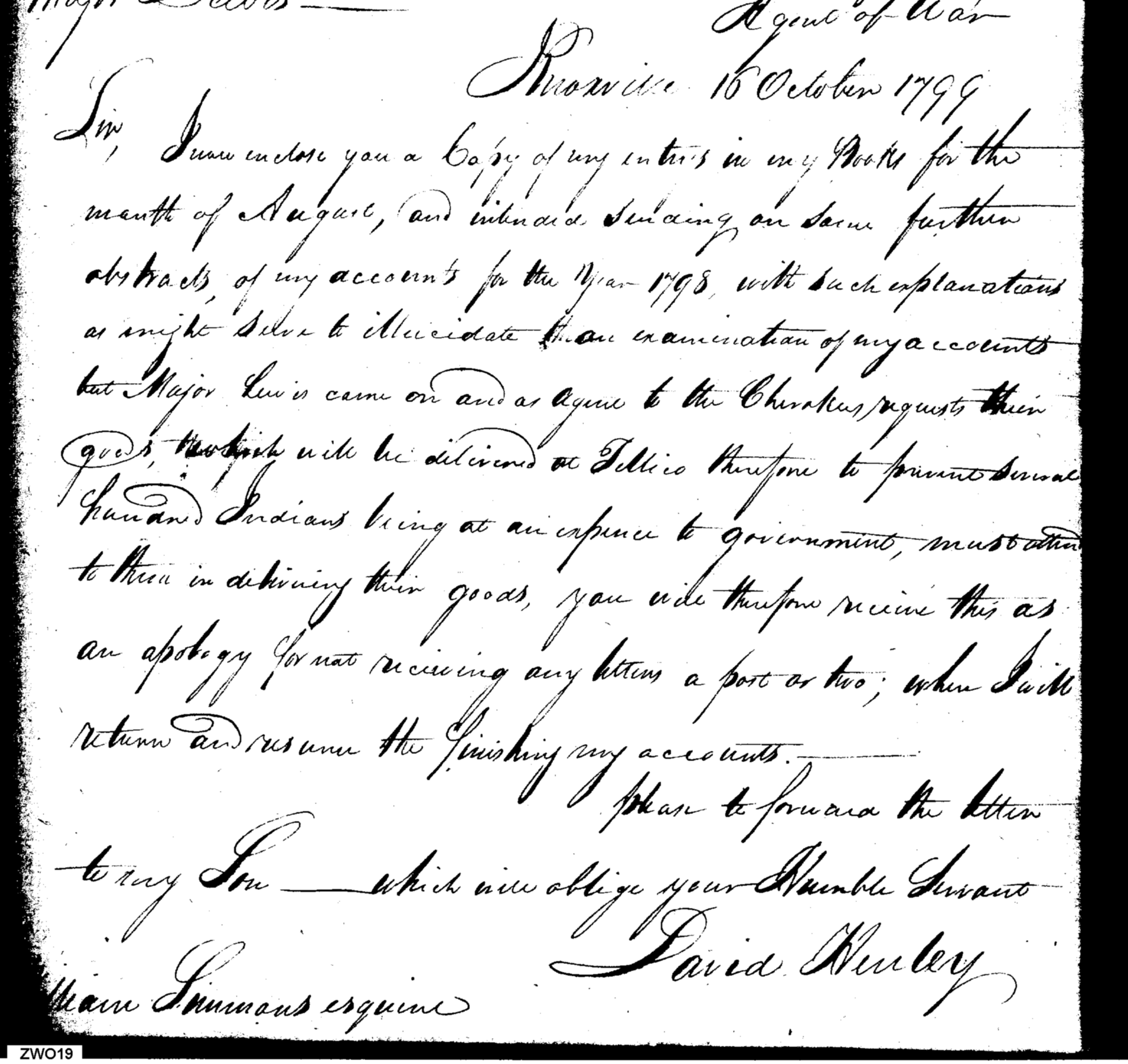 - Document: Sends Account Books; Refers to Major Lewis's Work with Cherokees