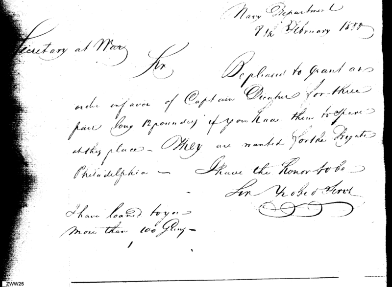 - In source: Collection: Letters Sent by the Secretary of the Navy to Federal Executive Agents (Letters to President, Secretary of State, Secretary of War, and Letters to (Requisitions on) Secretary of the Treasury and other Treasury Department Officials), June 1798-June 1824. (RG45)