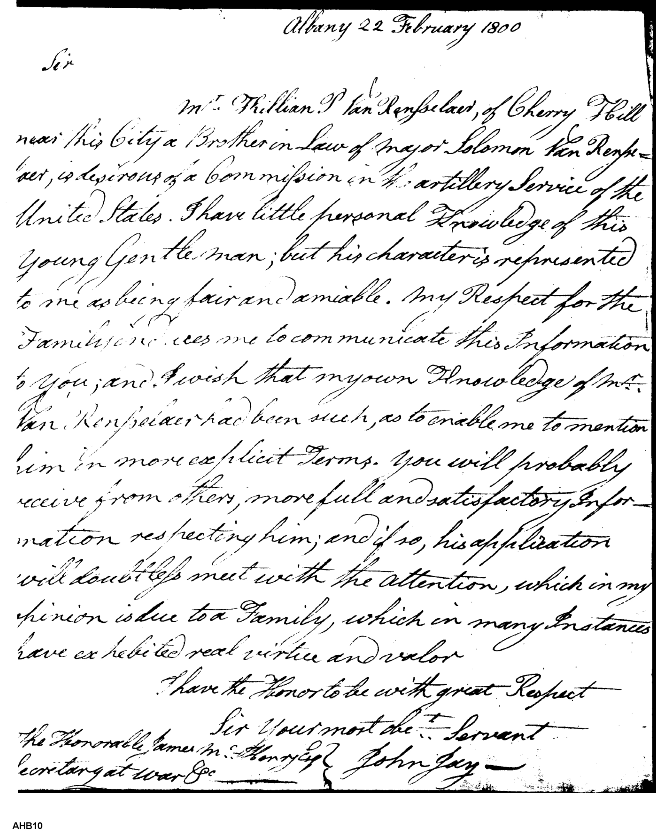 - Document: A letter of recommendation from his Excellency John Jay to the Secretary of War