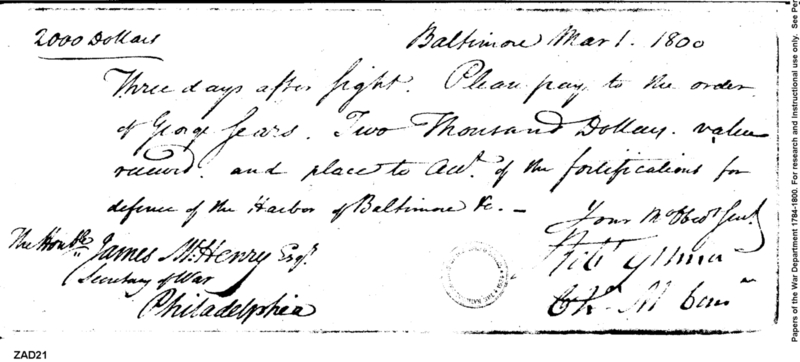 - Document: Request to Pay George Sears, Account of Fortifications at Baltimore Harbor