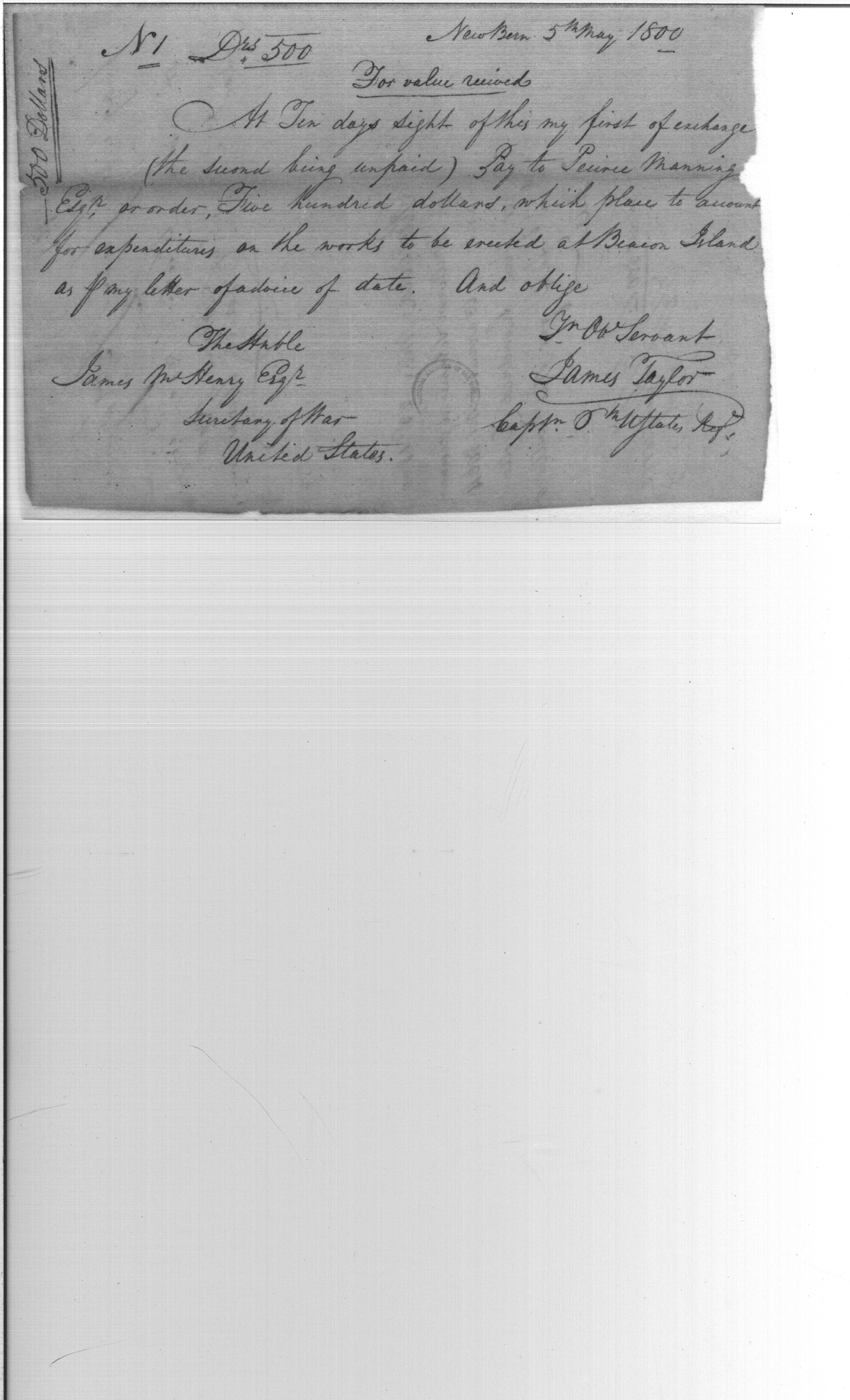 - Document: Payment from James Taylor, Captain 6th United States Regiment to Pierce Manning for expenditures on the works to be erected at Beacon Island, North Carolina