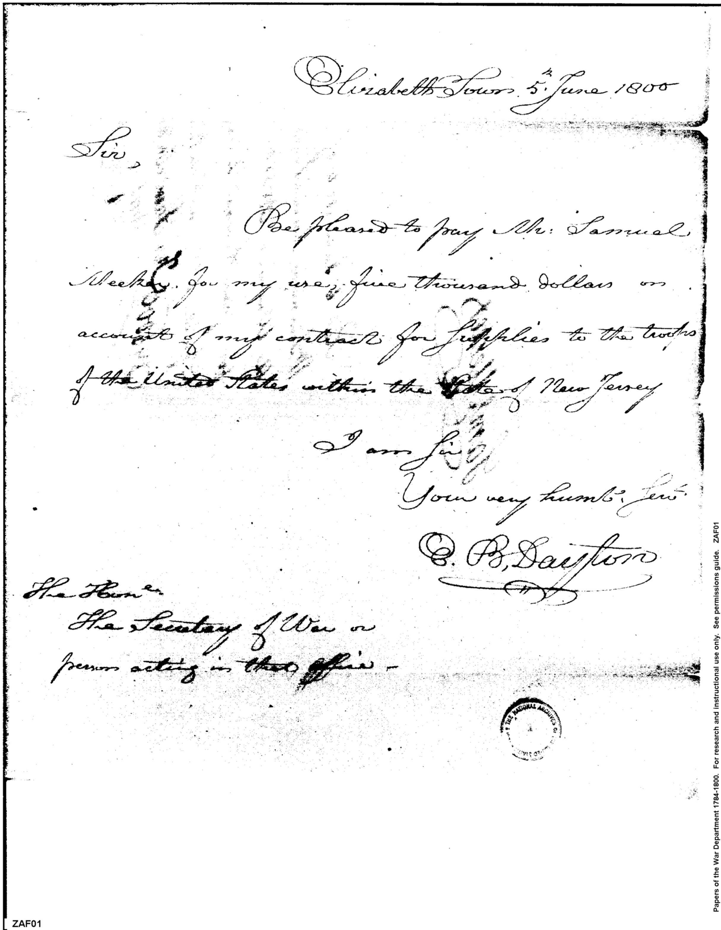 - Document: Payment to Samuel Meeker for supplies to United States troops in New Jersey