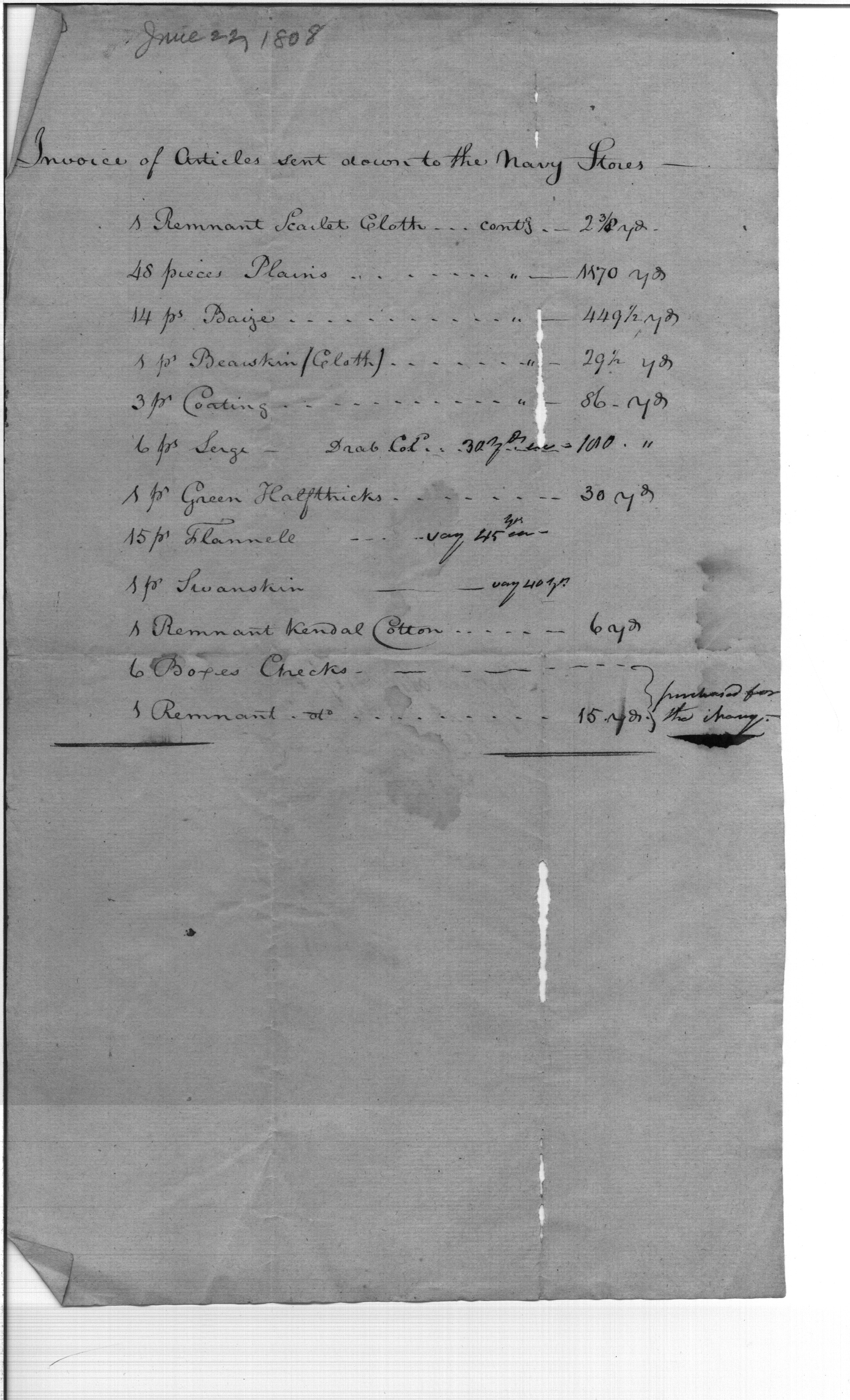 Articles Sent to the Navy Stores
