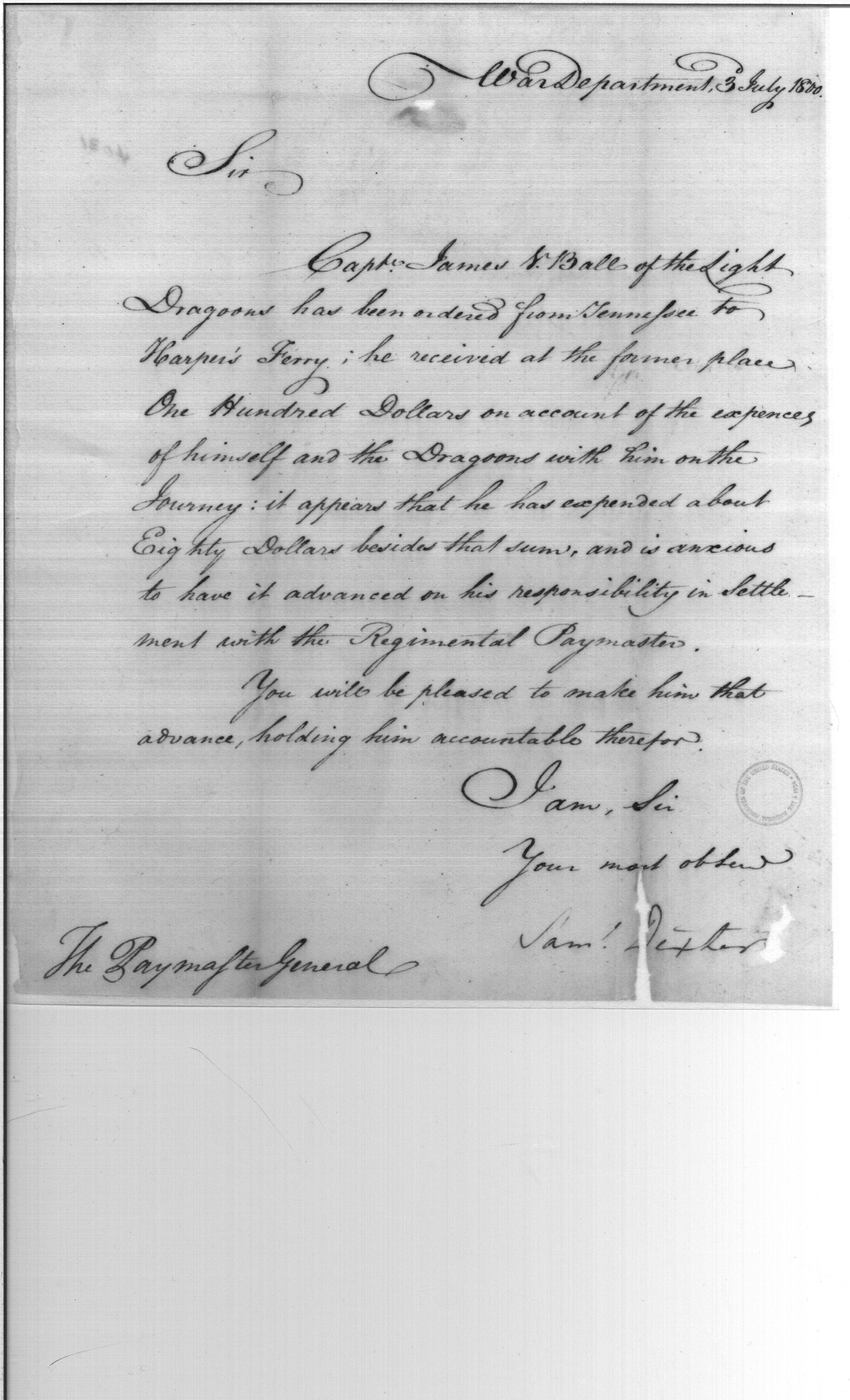 - Document: Advance of Pay and Subsistence Captain James Ball, Ordered to Harpers Ferry