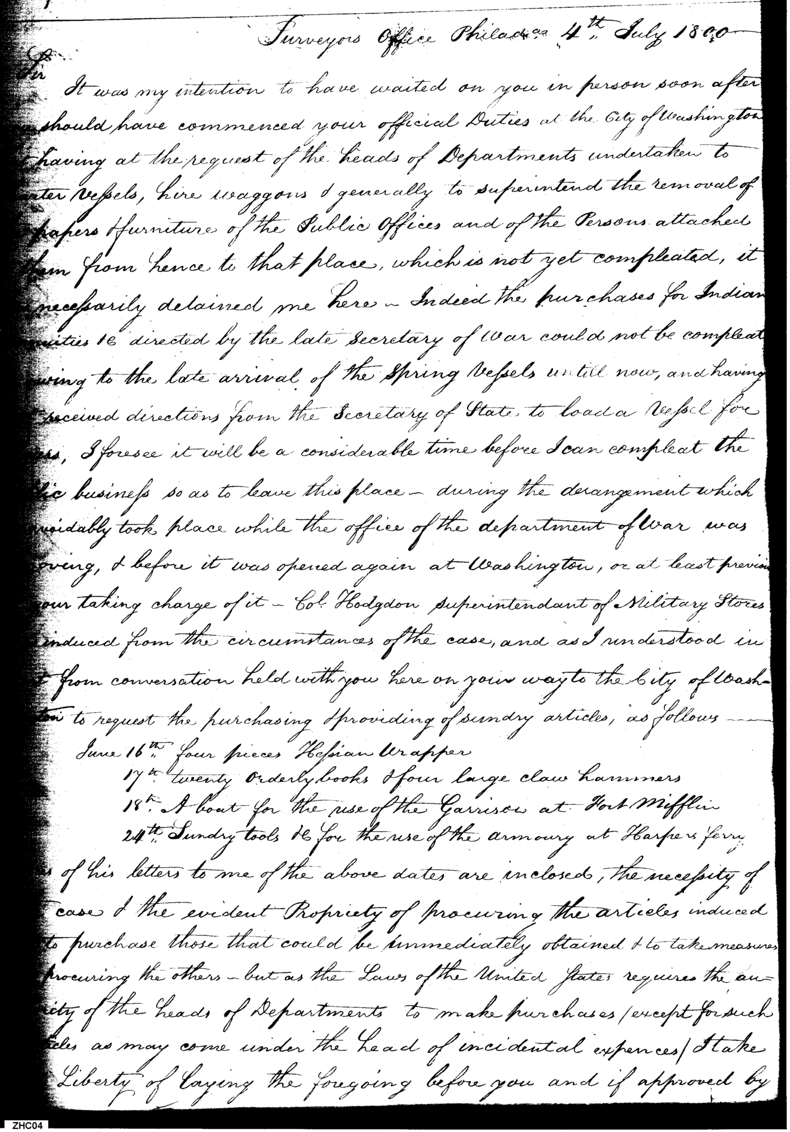 - In source: Collection: Letterbook of the Purveyor of Public Supplies, May2, 1800-Jul 24, 1802. 1 vol. (RG45)