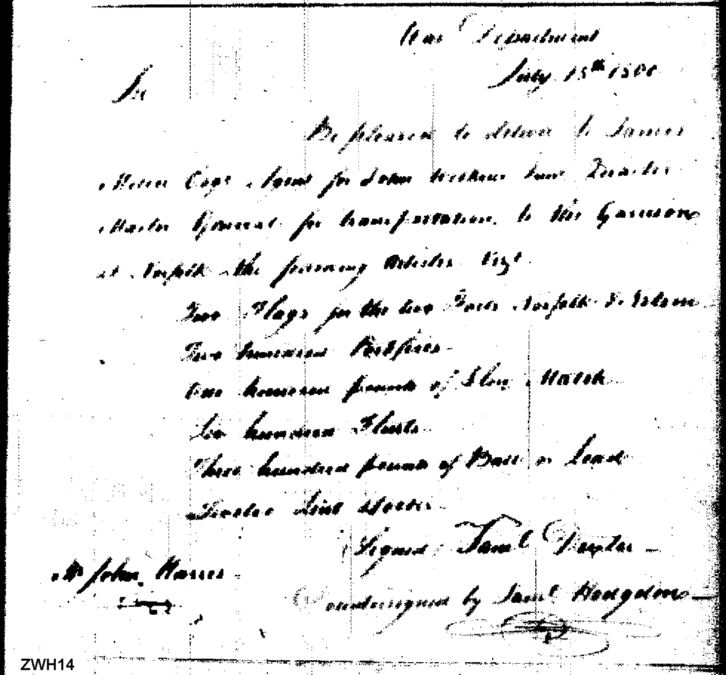 - Document: Request to deliver to flags, ordnance to Norfolk garrison