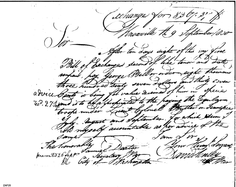 - Document: Bill of exchange, pay George Bell for the paying of the regular army under Lieutenant Colonel Butler, Tennessee