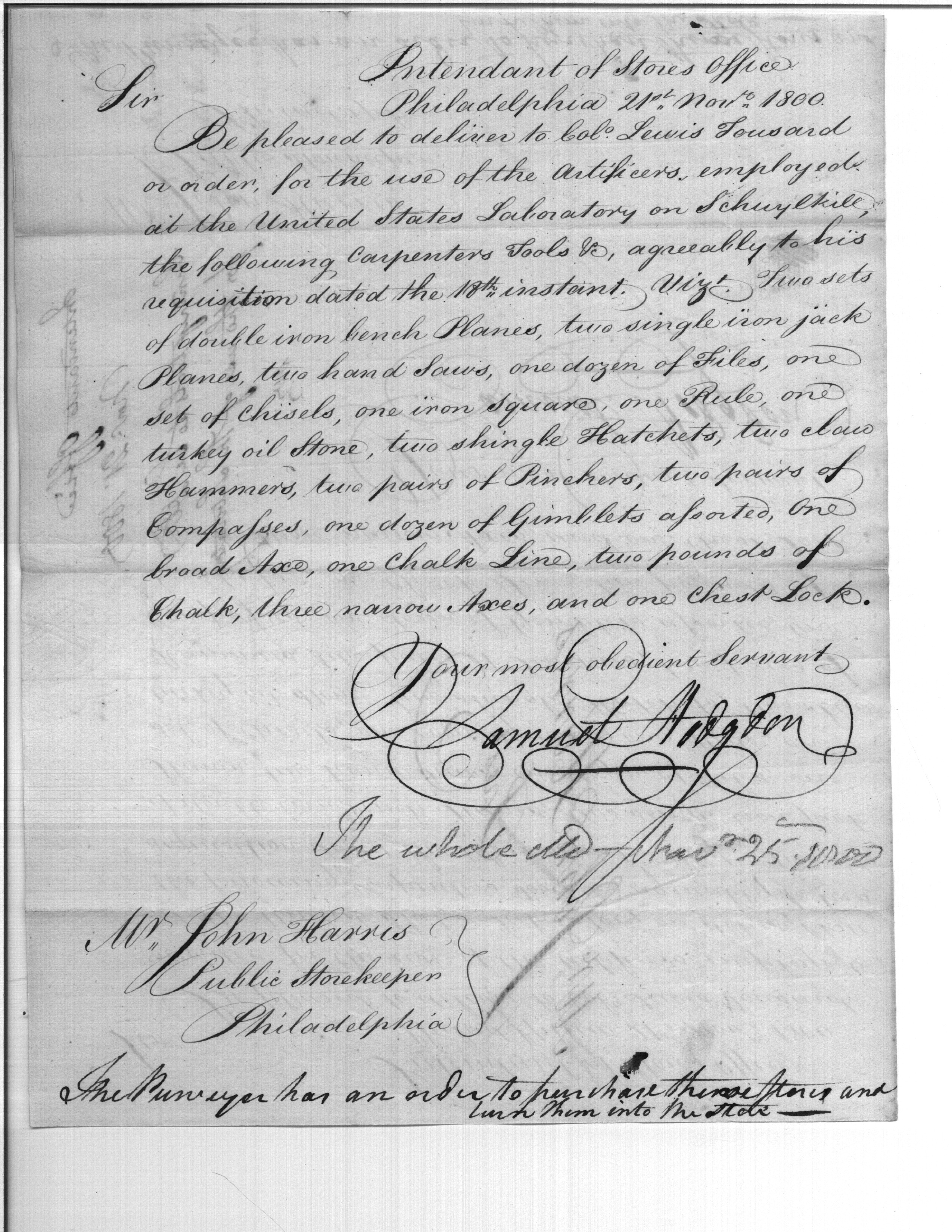 - Document: Request for Issue of Carpenter's Tools for Artificers at Schuylkill Laboratory
