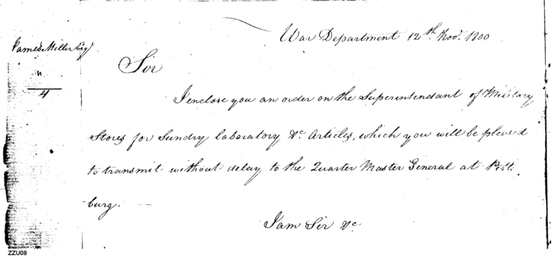 - In source: Collection: Letters Sent by the Secretary of War Relating to Procurement of Supplies (Order Books), Nov 12, 1800-Dec 31, 1889. (RG107) (M127)