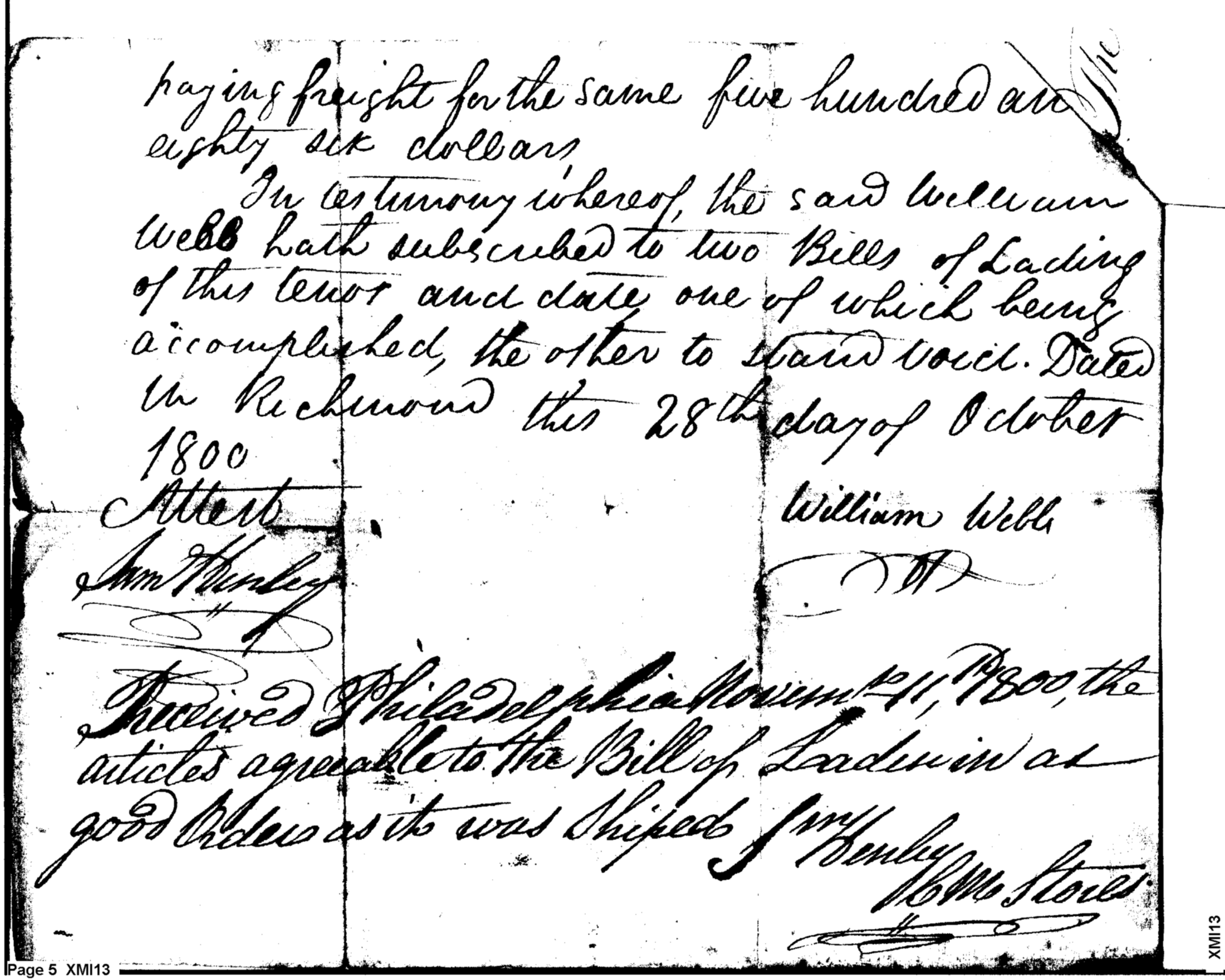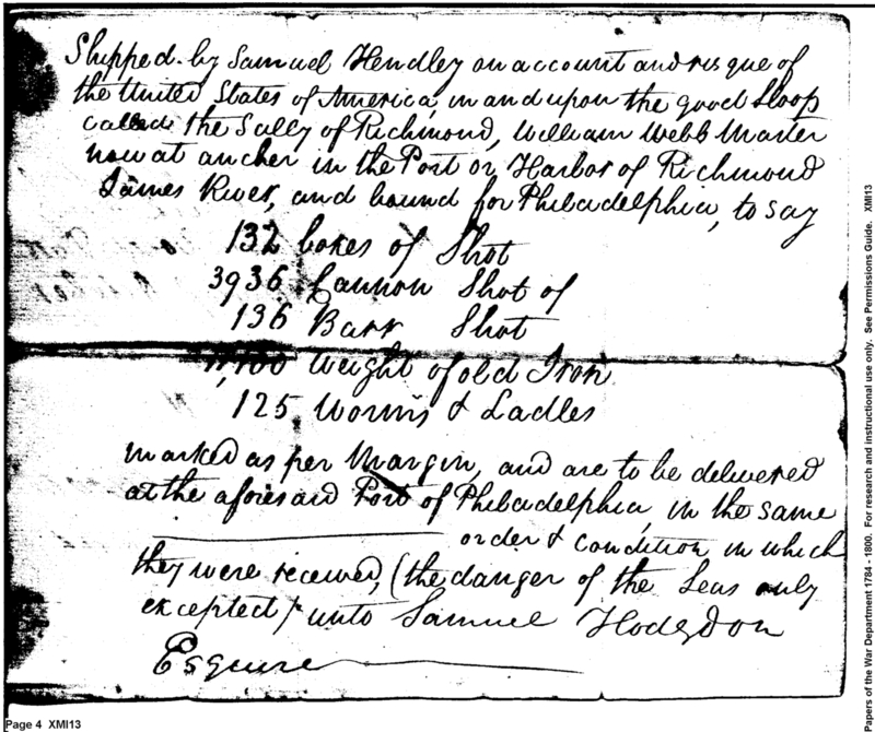 - Document: Bill of Lading for Military Stores Shipped from Richmond to Philadelphia