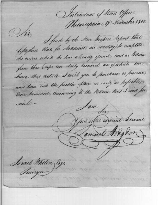 - In source: Collection: Correspondence, Reports, Returns, Bills, Accounts Current' Statements, Receipts, Vouchers and Contracts of Philadelphia Supply Agencies (Coxe and Irvine Papers), 1794-1842. (RG92)