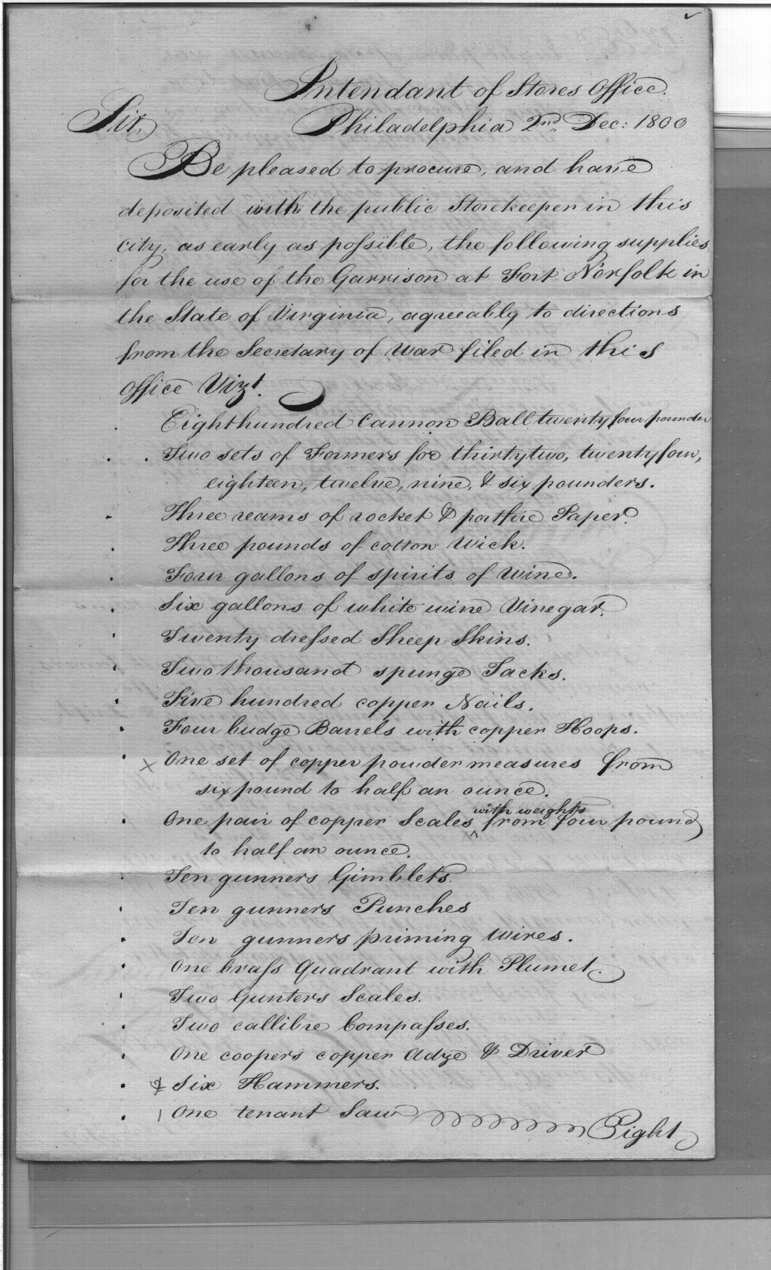 - Document: Supplies for Fort Norfolk Virginia