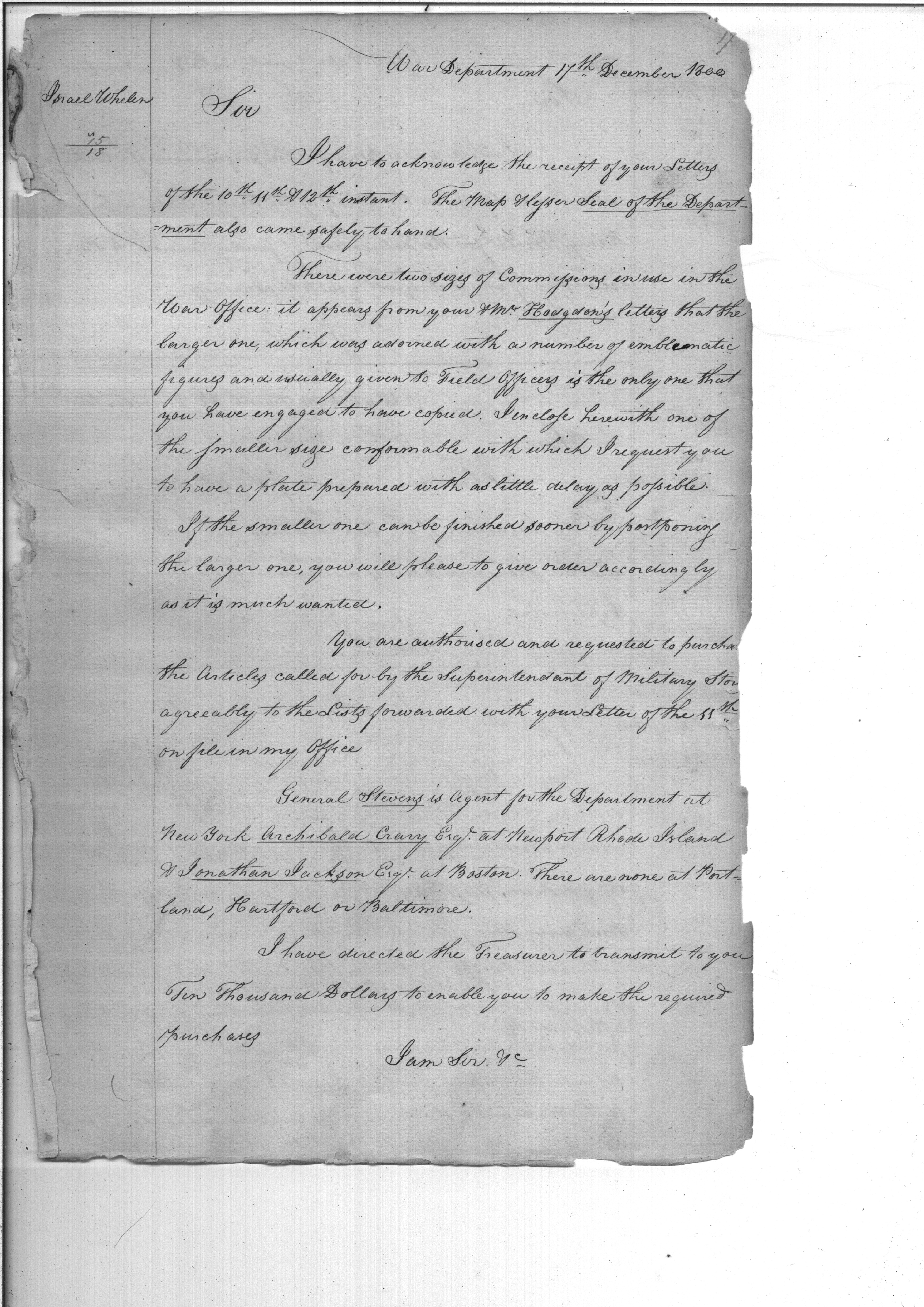 - In source: Collection: Letters Sent by the Secretary of War Relating to Procurement of Supplies (Order Books), Nov 12, 1800-Dec 31, 1889. (RG107) (M127)