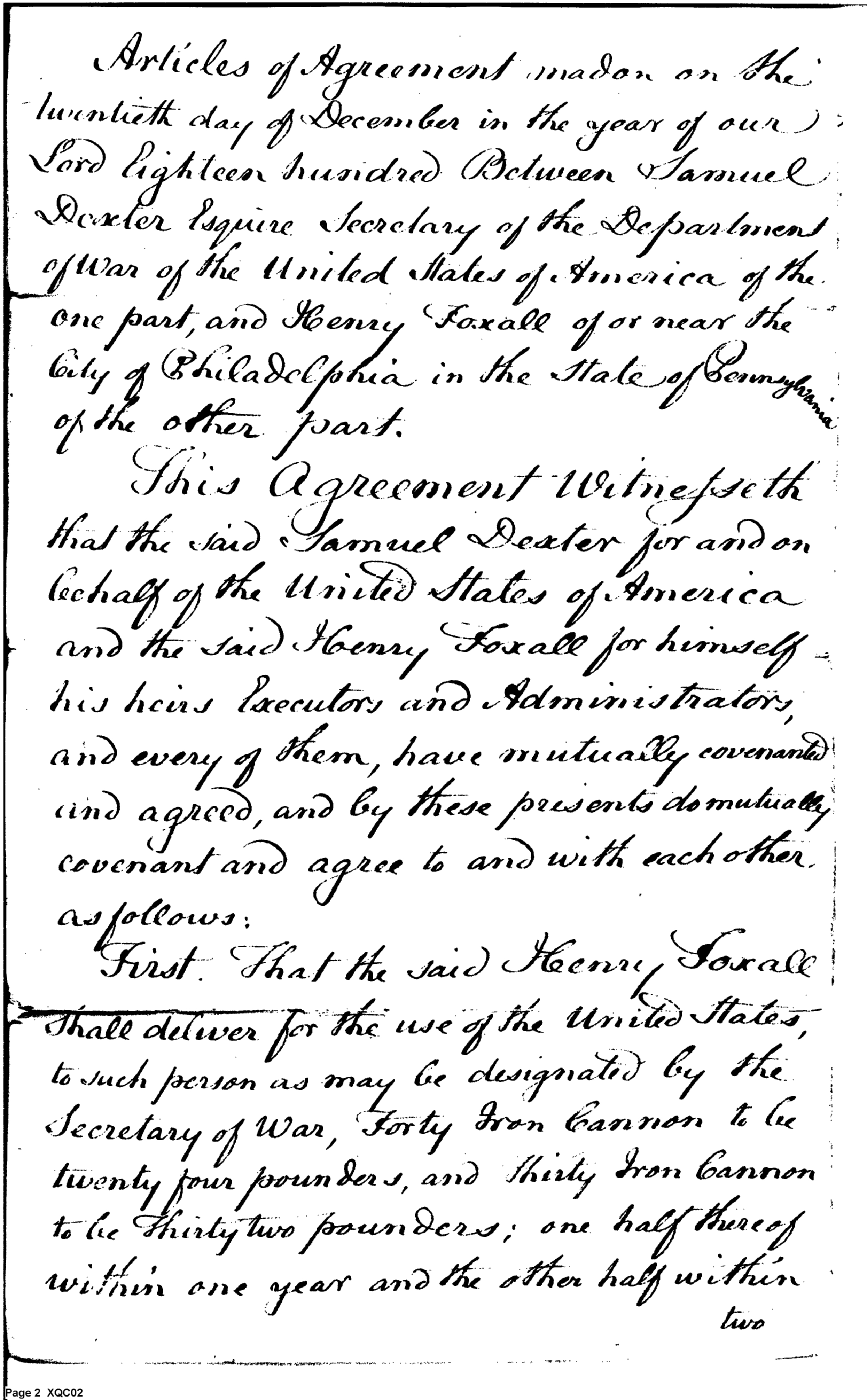 - Document: Contract for the Delivery of Cannon between Samuel Dexter and Henry Foxall