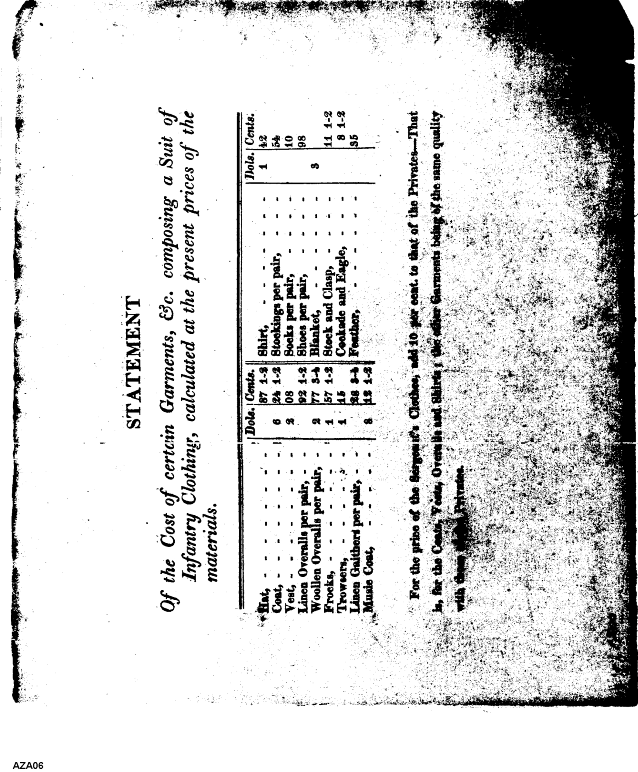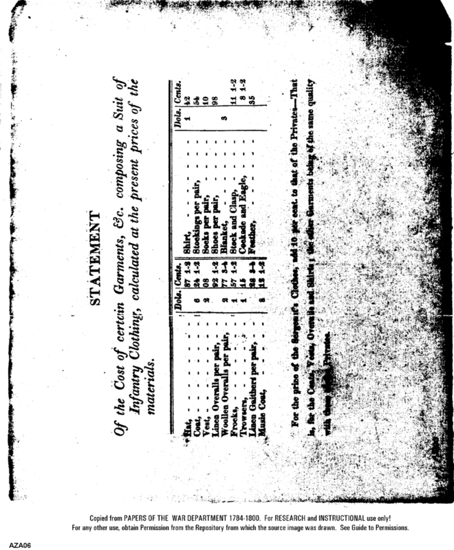 - Document: Statement of Cost of Certain Garments Comprising a Suit of Infantry Clothing