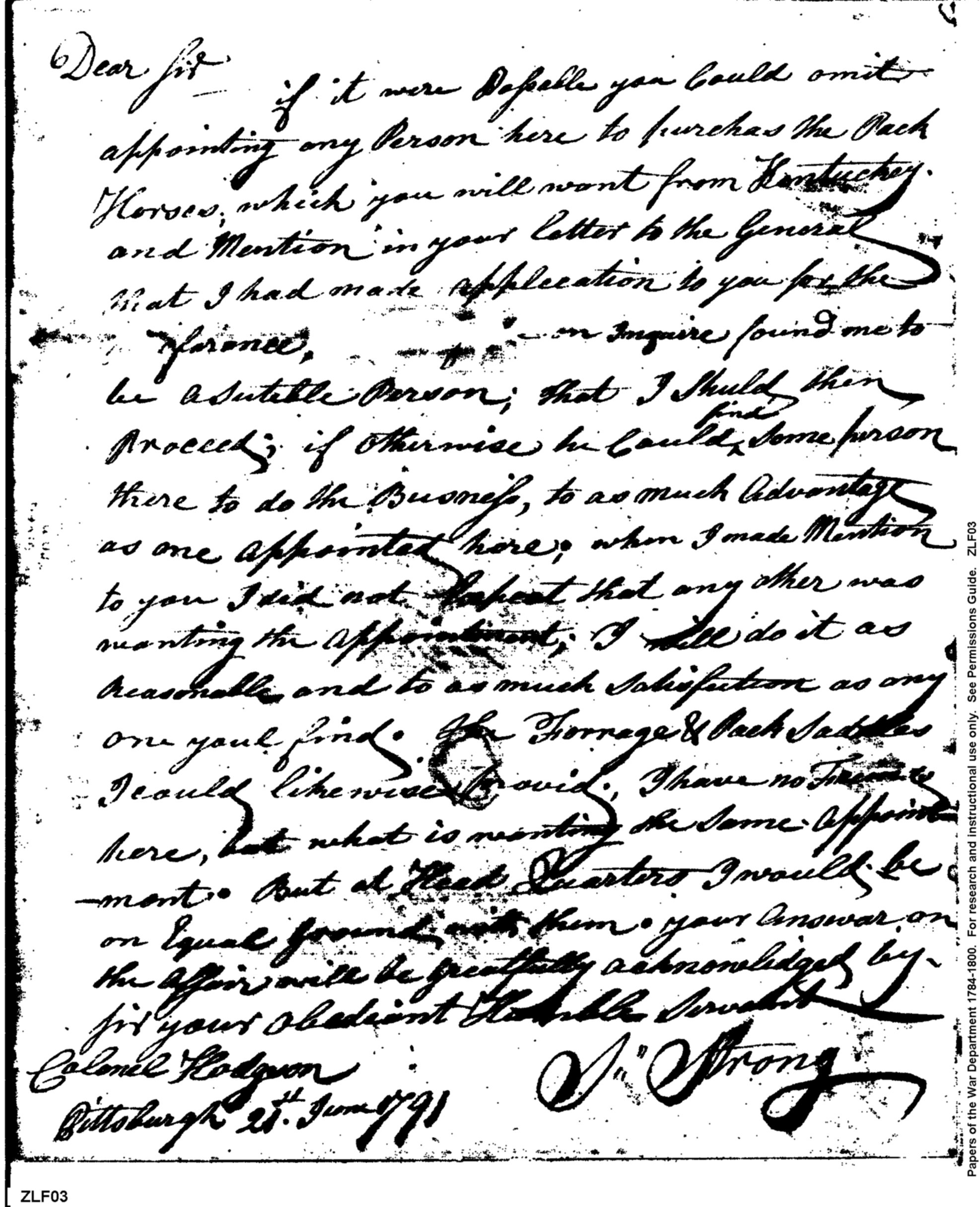 Document ViewerLetter from Mr S. Strong to Colonel Samuel Hodgdon asking for job providing packhorses from Kentucky