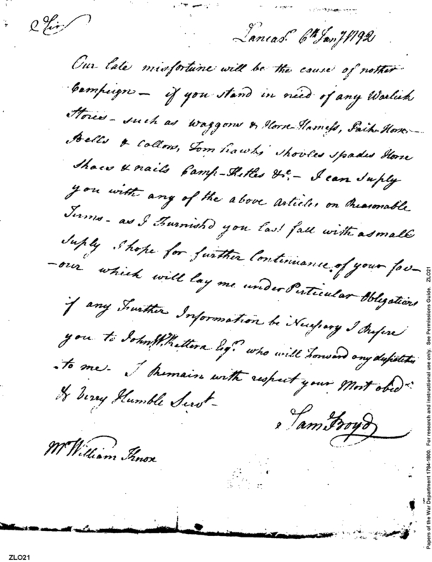 - Document: Letter from Sam Boyd at Lancaster Ohio soliciting to be employed to make sundry articles for public use in the wake of unfortunate St. Clair expedition