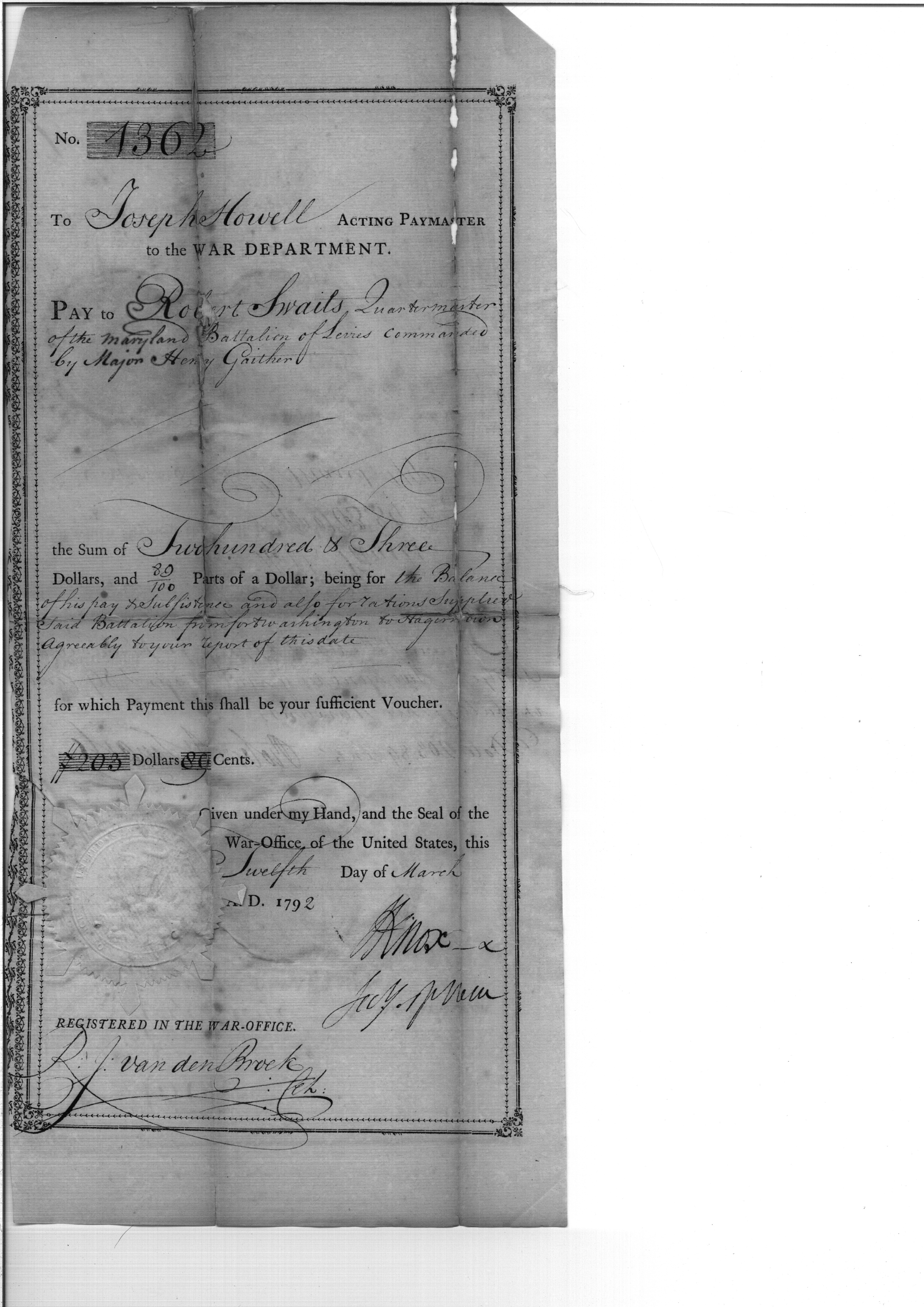 - Document: Payment to Robert Swaits, Quarter Master Maryland Battalion of Levies