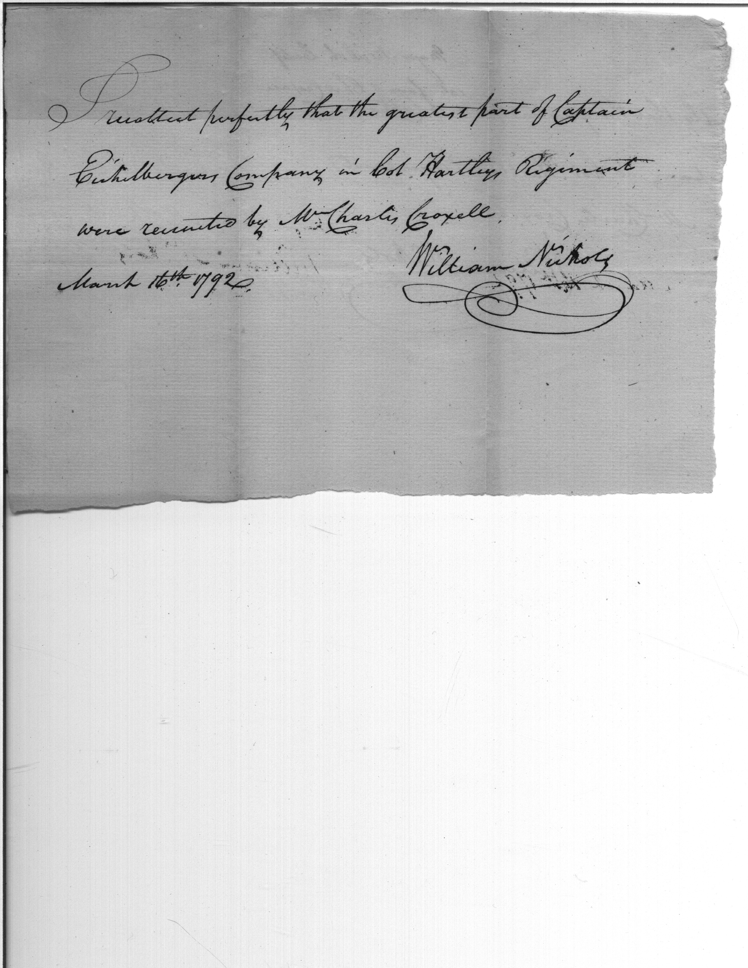 - Document: Certificate of William Nichols stating that the greater part of Captain Eichelberger's Company was recruited by Wm. Charles Croxell