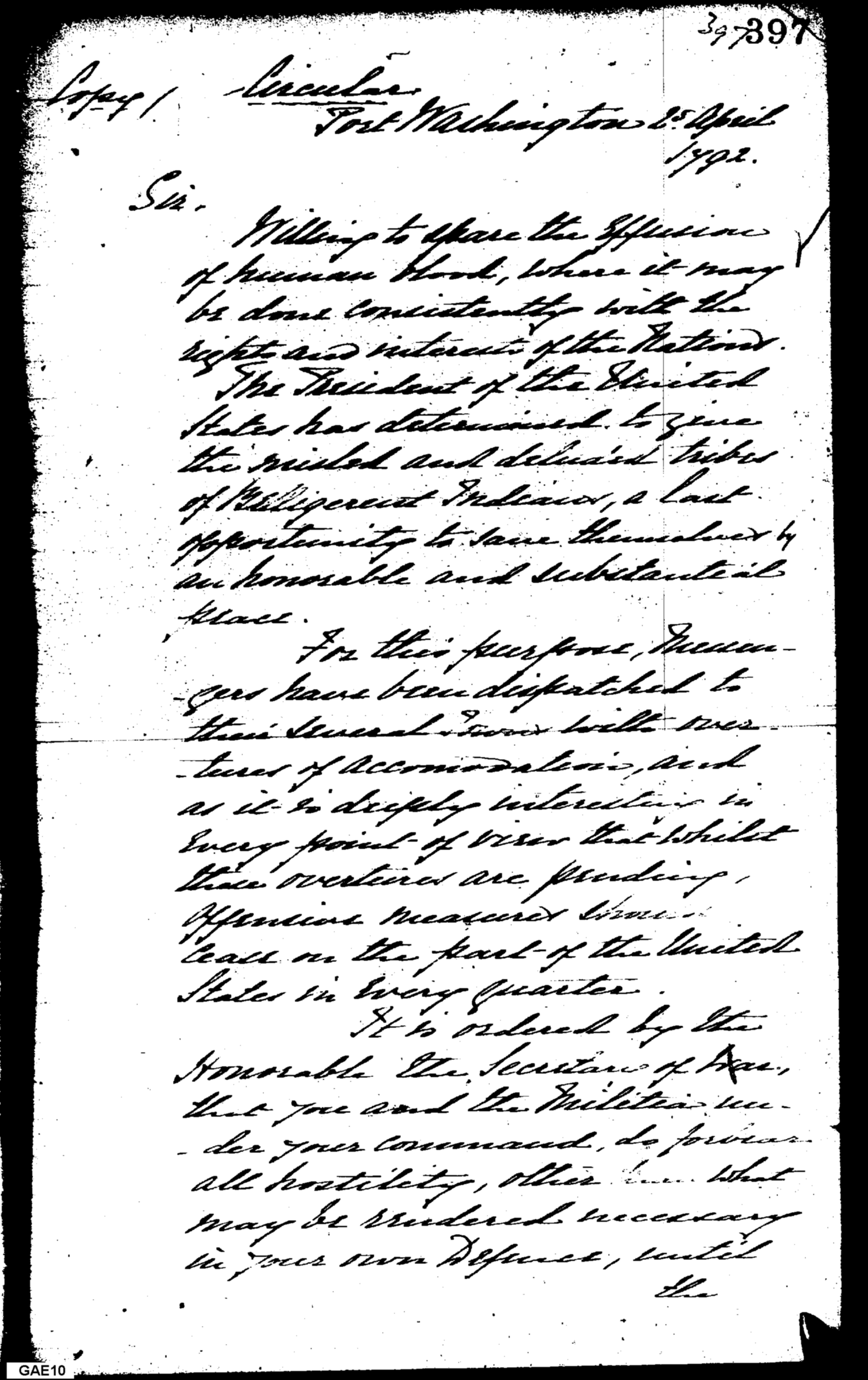 - Document: CIRCULAR: Notification of President's Offer to Indians for Peace