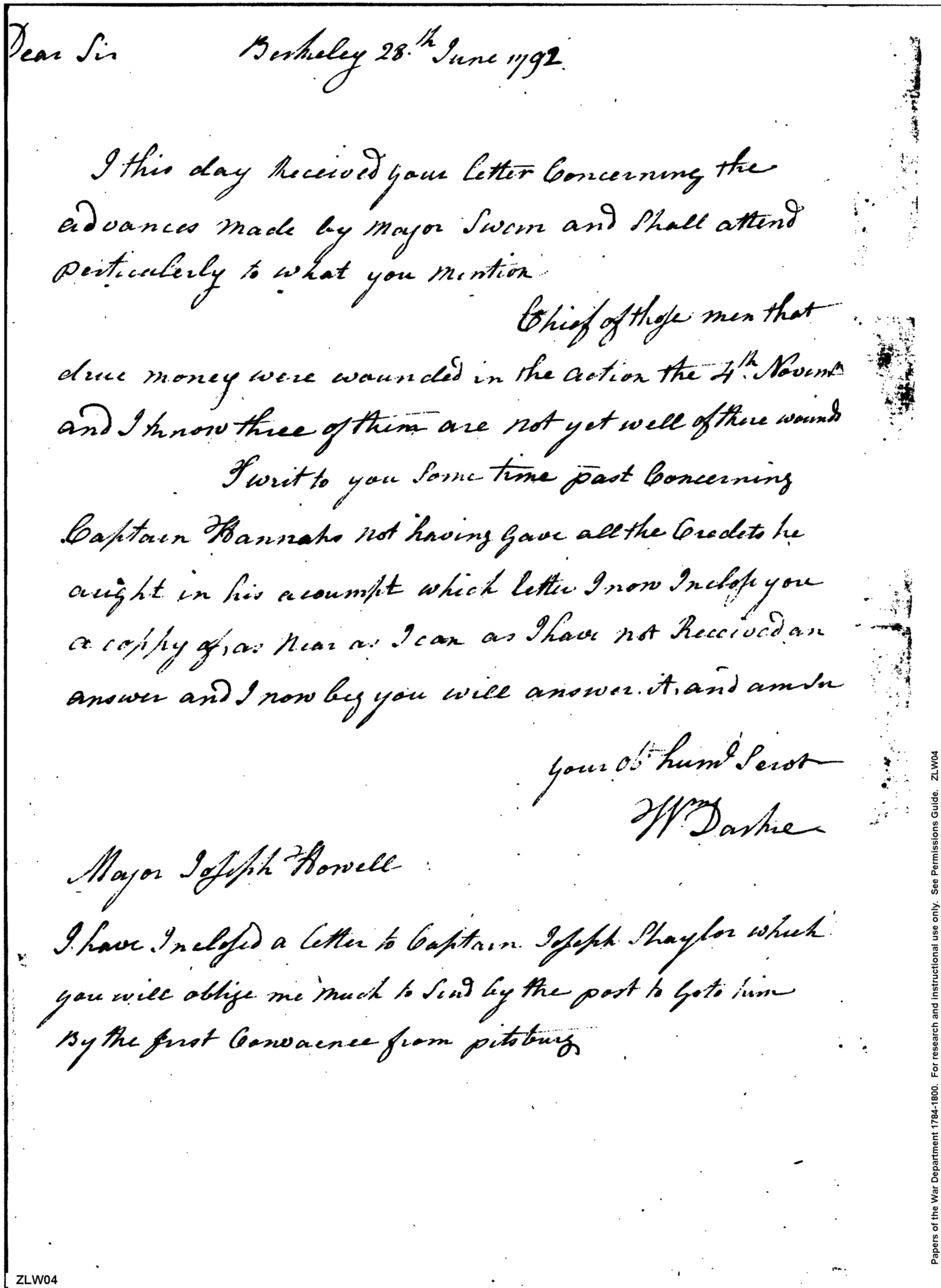 - Document: Letter from General William Darke to Joseph Howell concerning advances made by Major Caleb Swan to men wounded in St Clair expedition