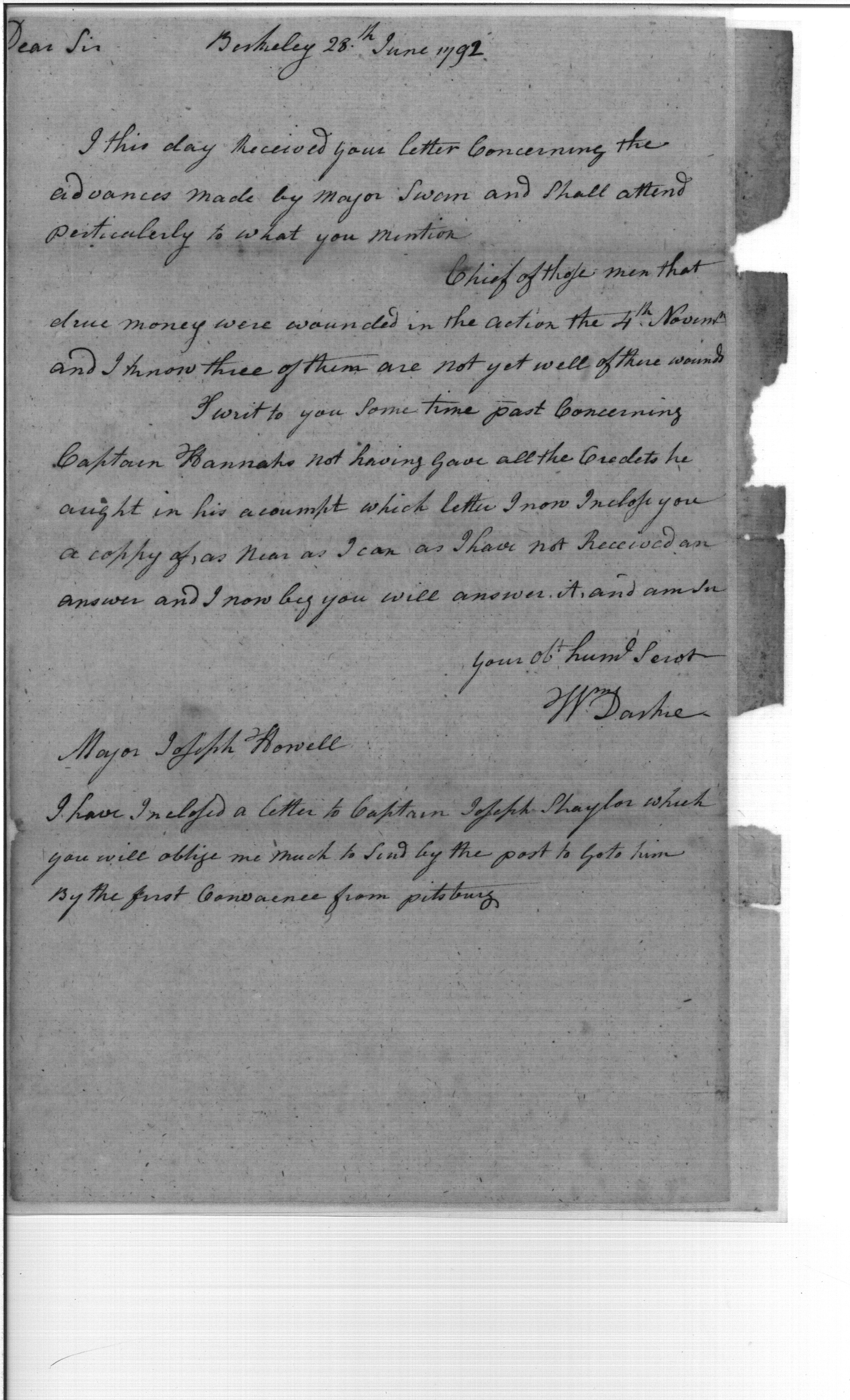 - Document: Letter from General William Darke to Joseph Howell concerning advances made by Major Caleb Swan to men wounded in St Clair expedition