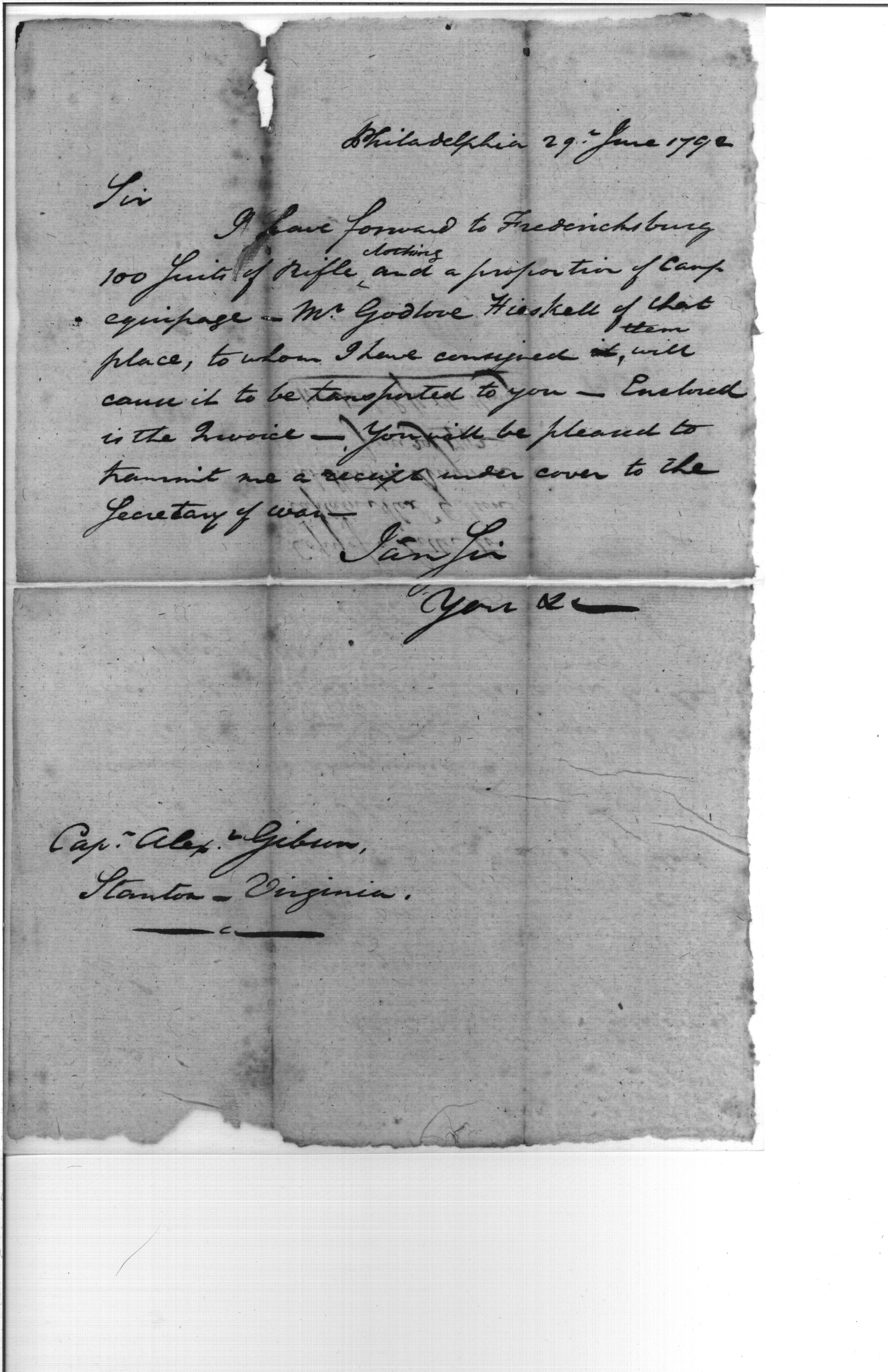 - Document: Clothing and Camp Equipage to be forwarded to Captain Gibson
