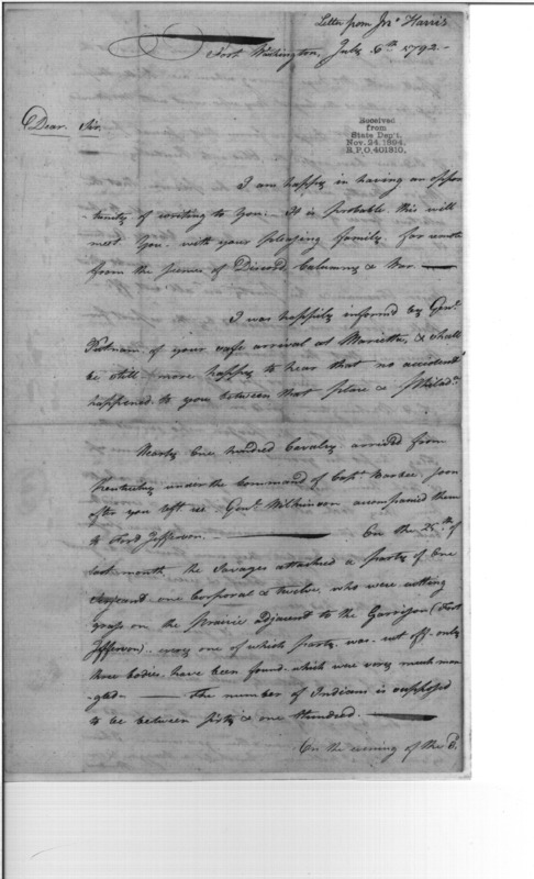 - Document: Letter from John Harris, Fort Washington, to Samuel Hodgdon on Indian attacks and expression for support for Hodgdon against slanderous attacks