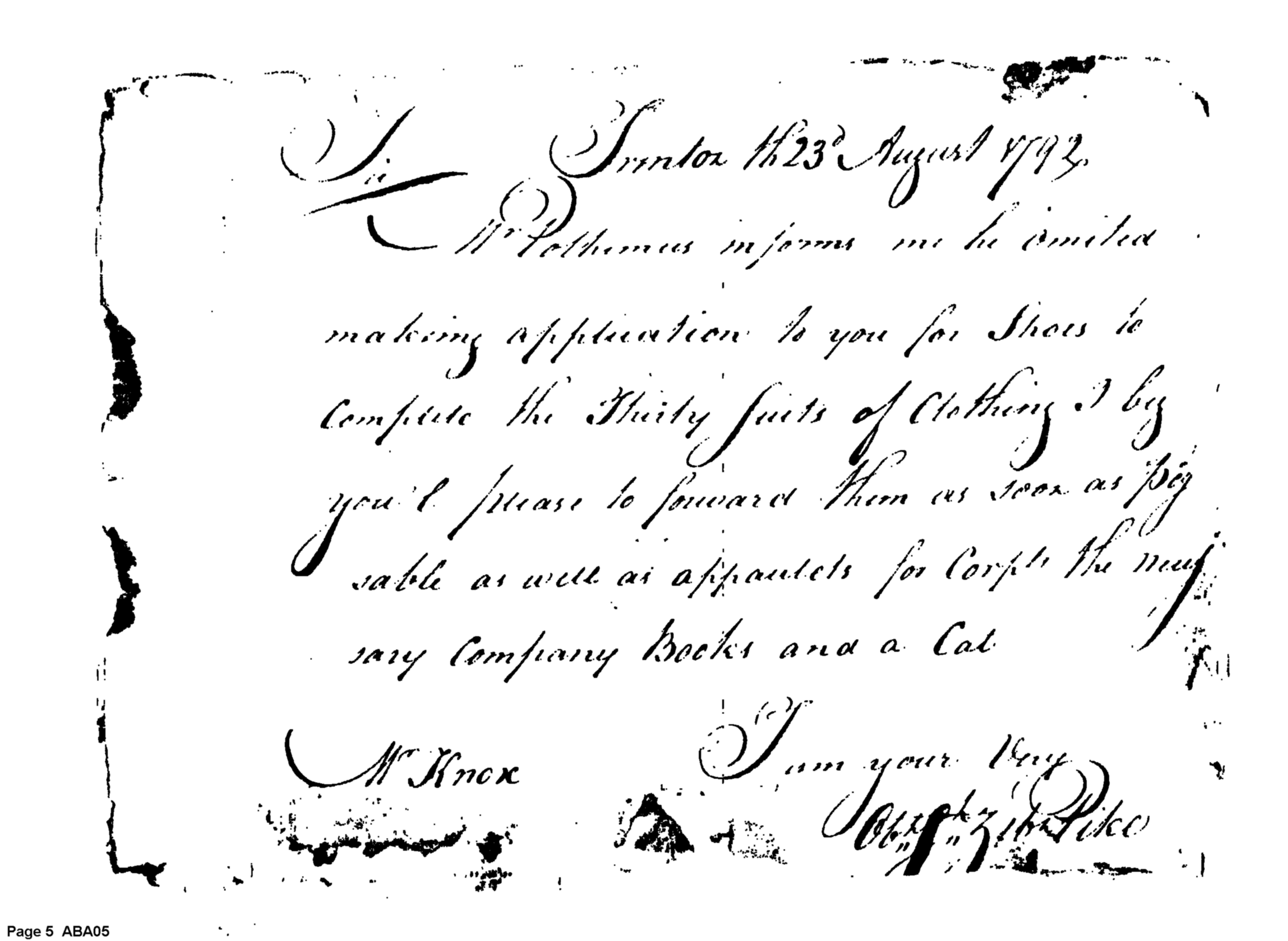 - Document: Request for shoes, clothing, epaulets, company books, and a cat