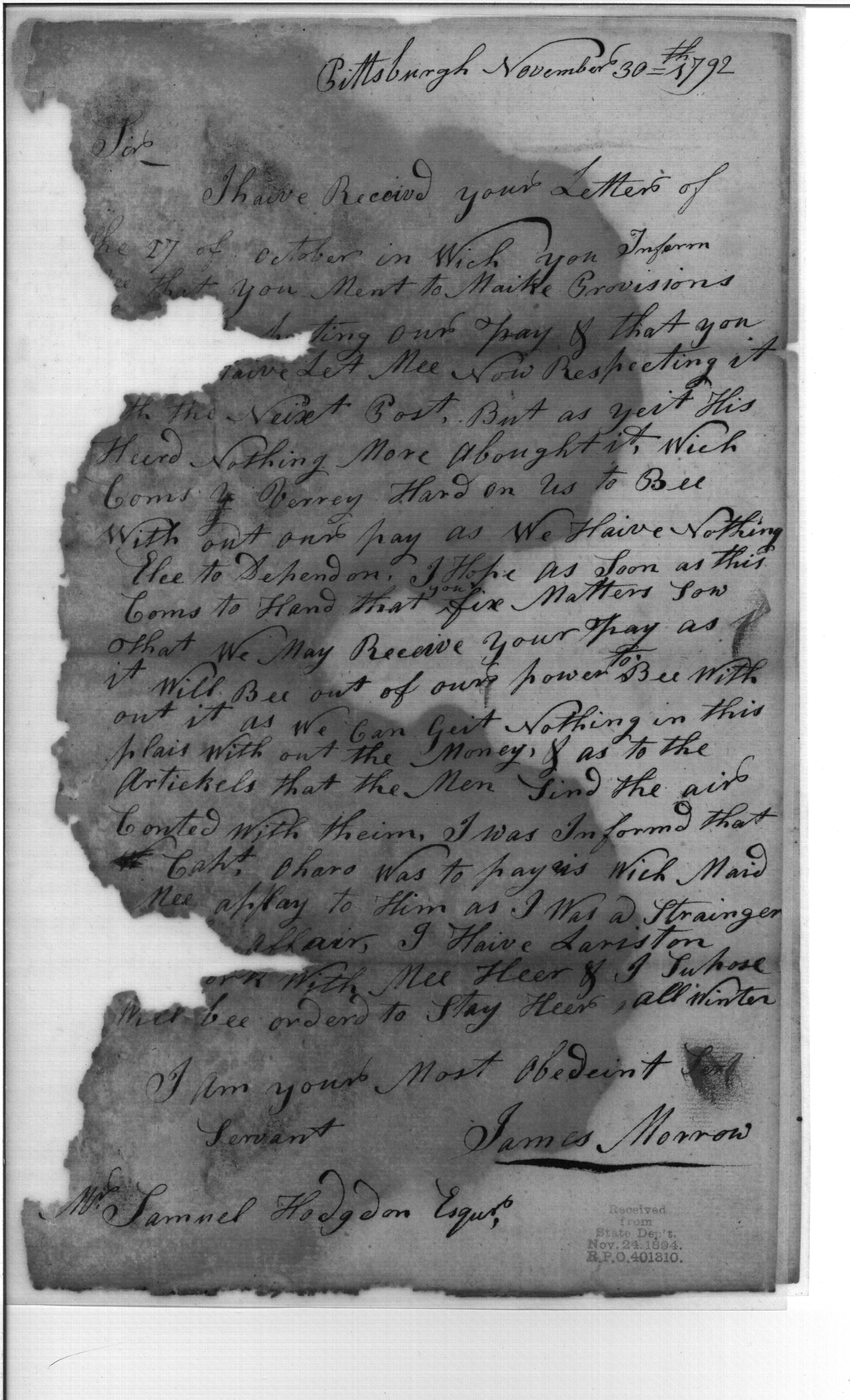 - Document: Letter from James Morrow to Samuel Hodgdon on provisions and pay