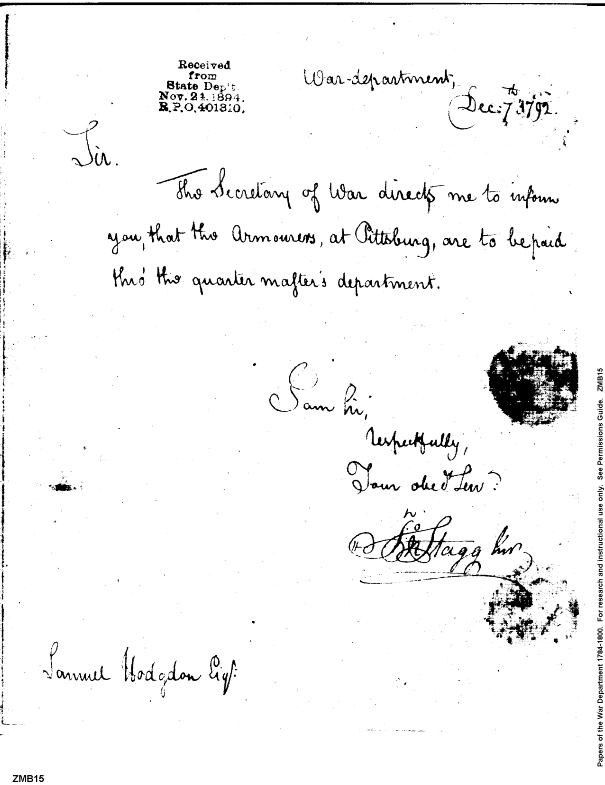 - Document: Armorers at Pittsburg to be paid through Quartermaster's Department