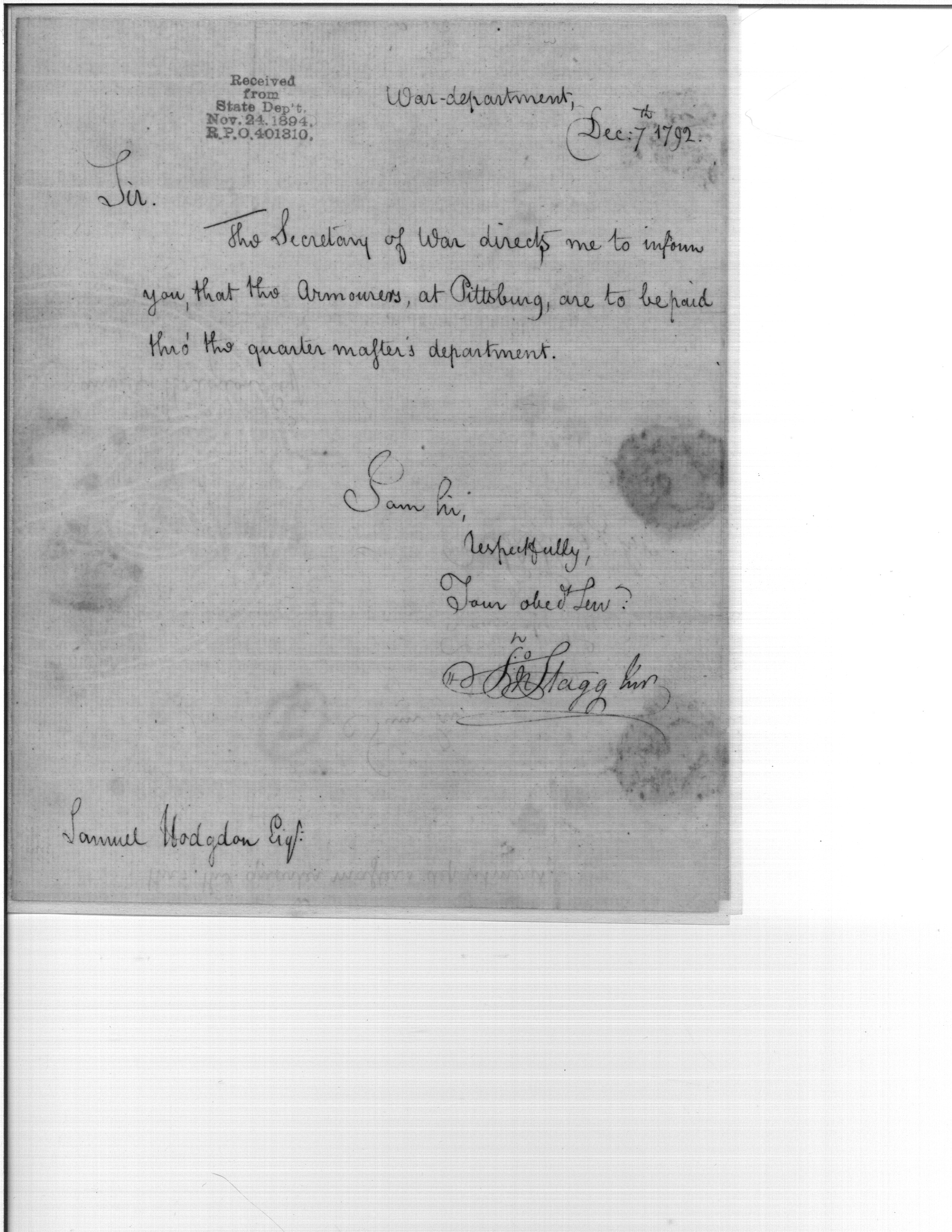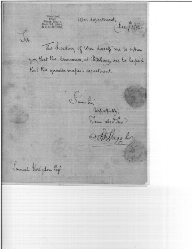 - Document: Armorers at Pittsburg to be paid through Quartermaster's Department