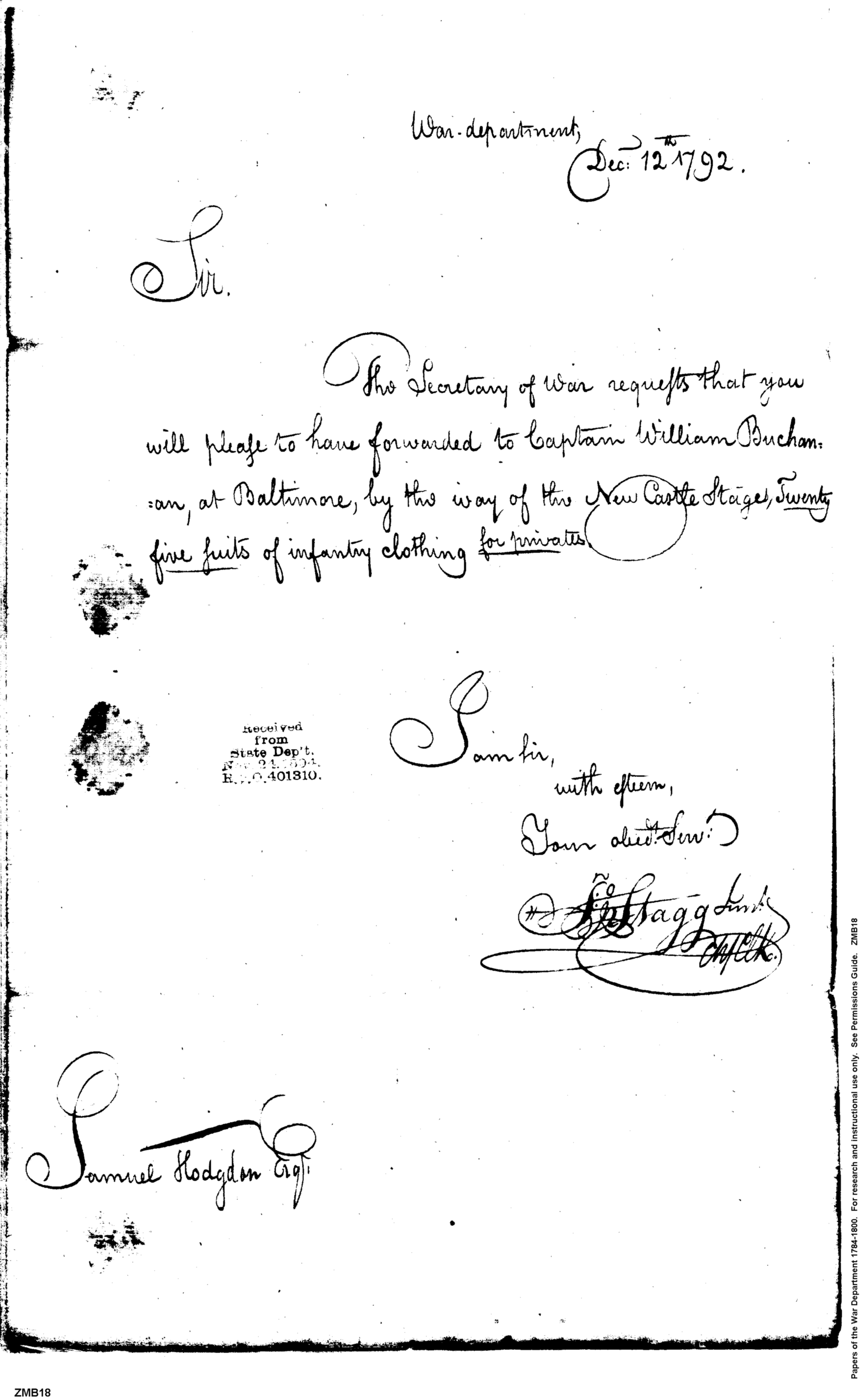 - Document: Request that Infantry Clothing be Forwarded to Captain William Buchanan of Baltimore