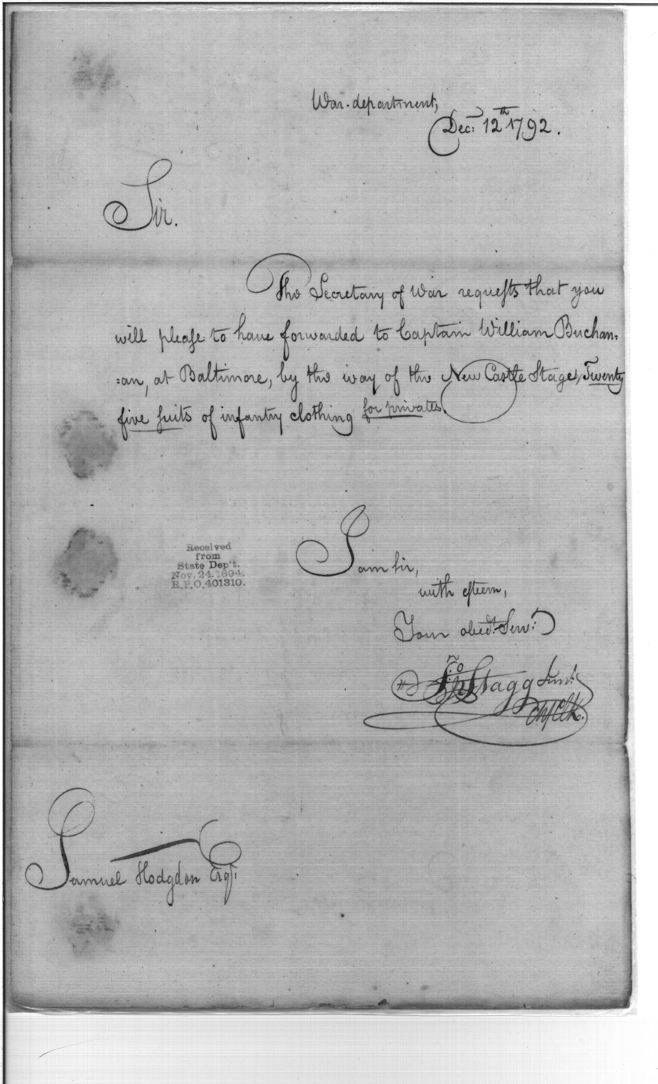 - Document: Request that Infantry Clothing be Forwarded to Captain William Buchanan of Baltimore