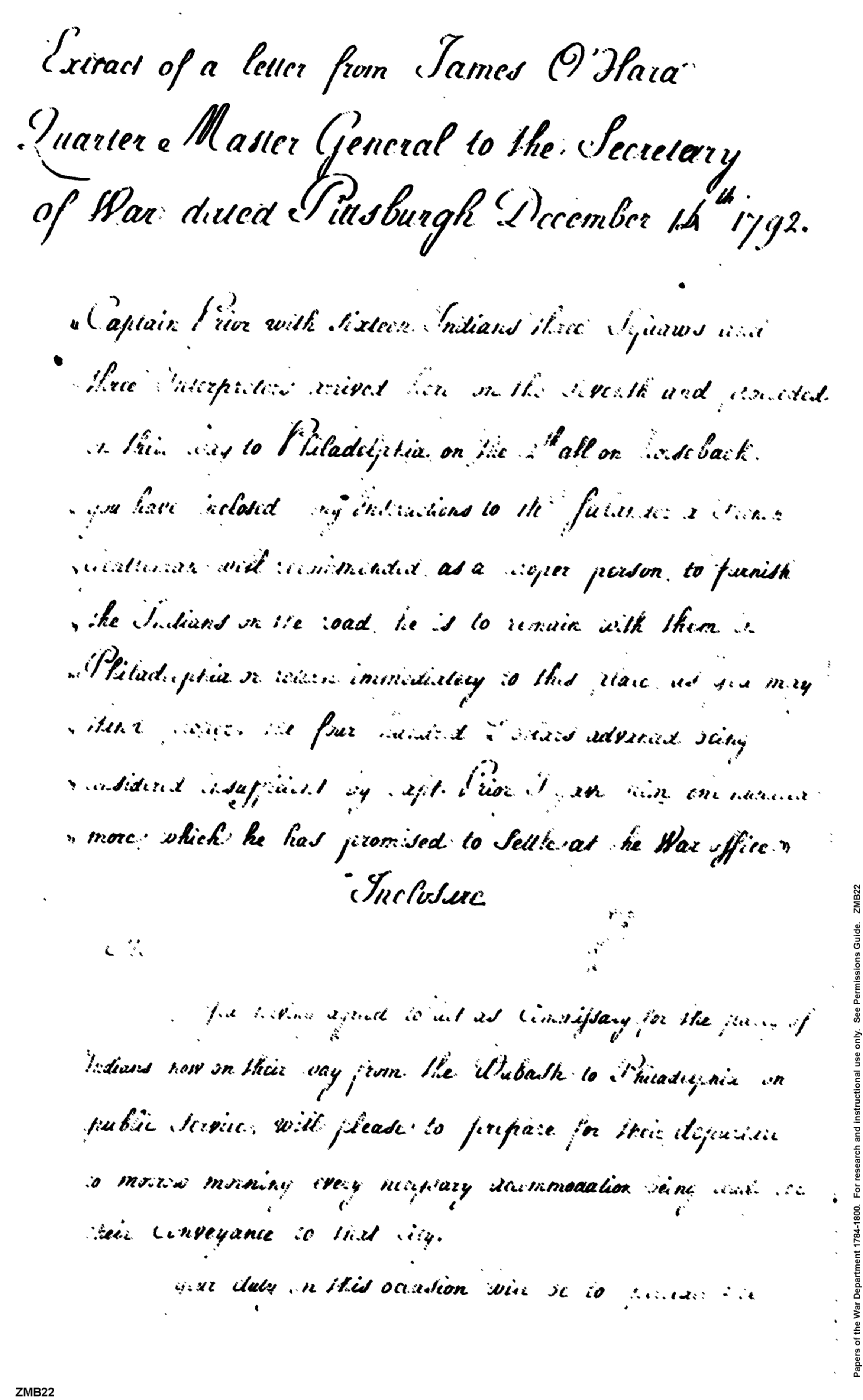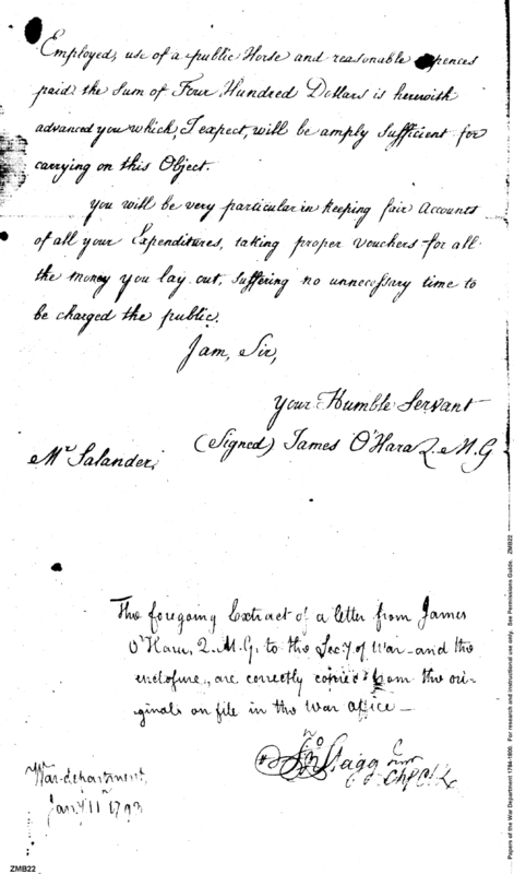 - Document: Extract of letter from James O'Hara, Quarter Master General to the Secretary of War Henry Knox with enclosure to Mr Salander