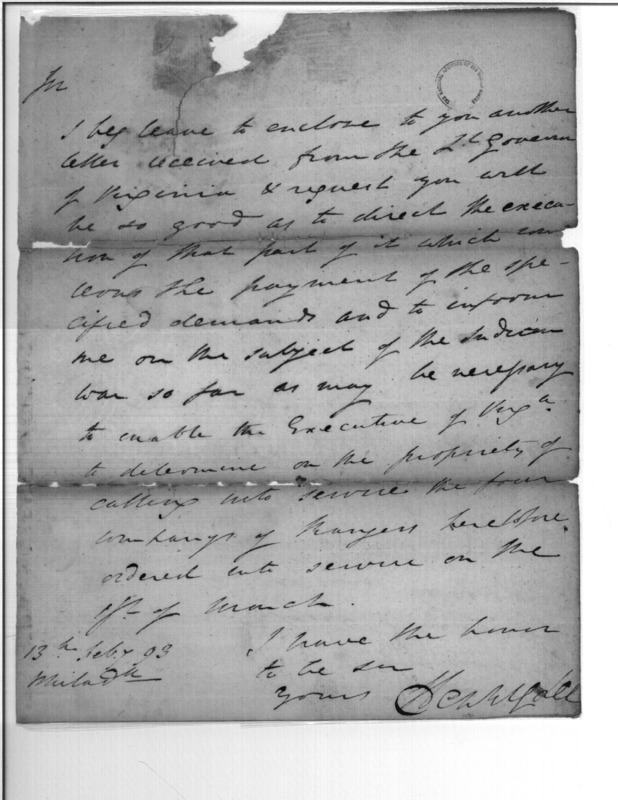 Document ViewerLetter from the Governor of Virginia; request for information on the Indian Wars