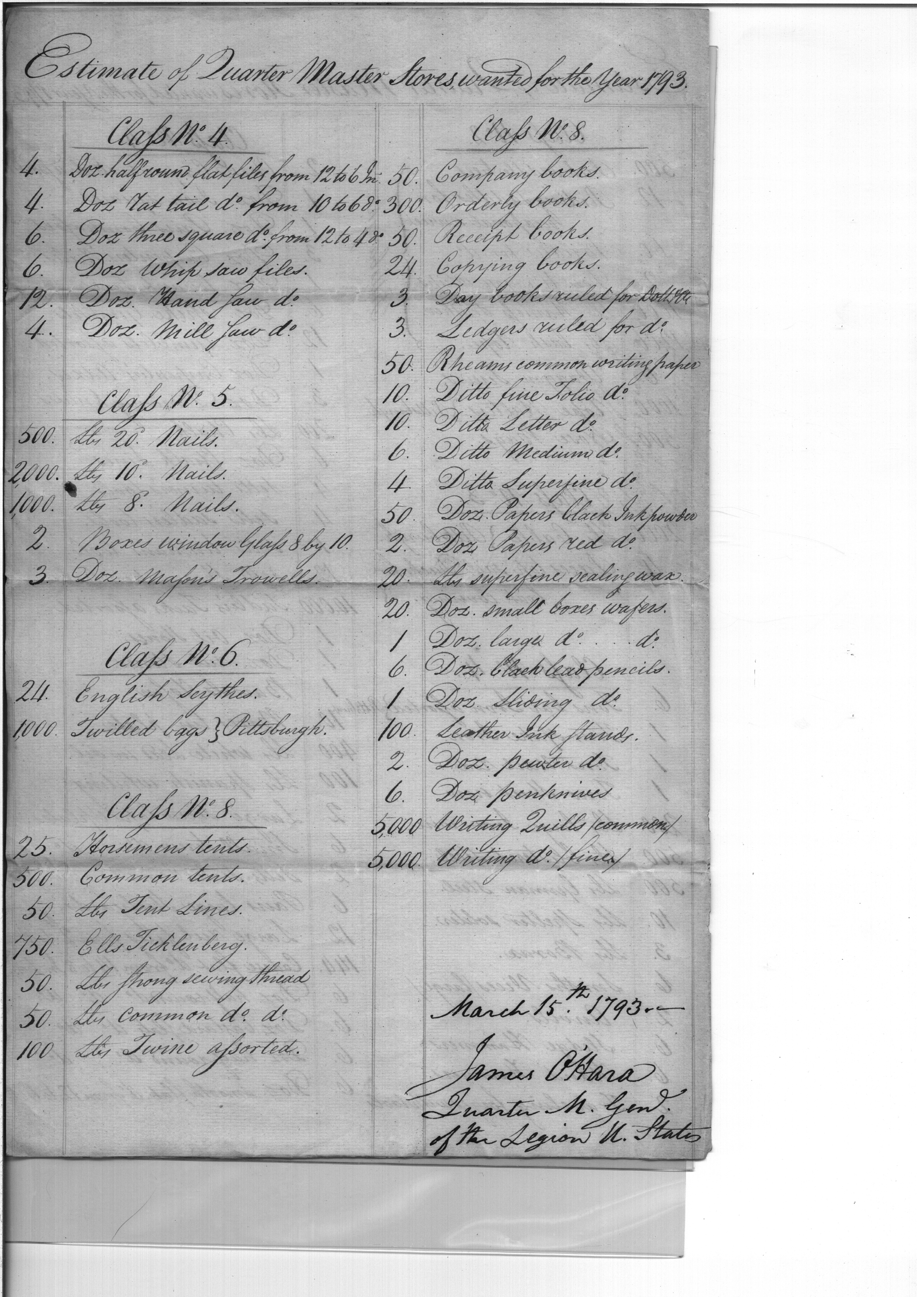 - Document: Estimate of Quarter Master Stores wanted for the Year 1793